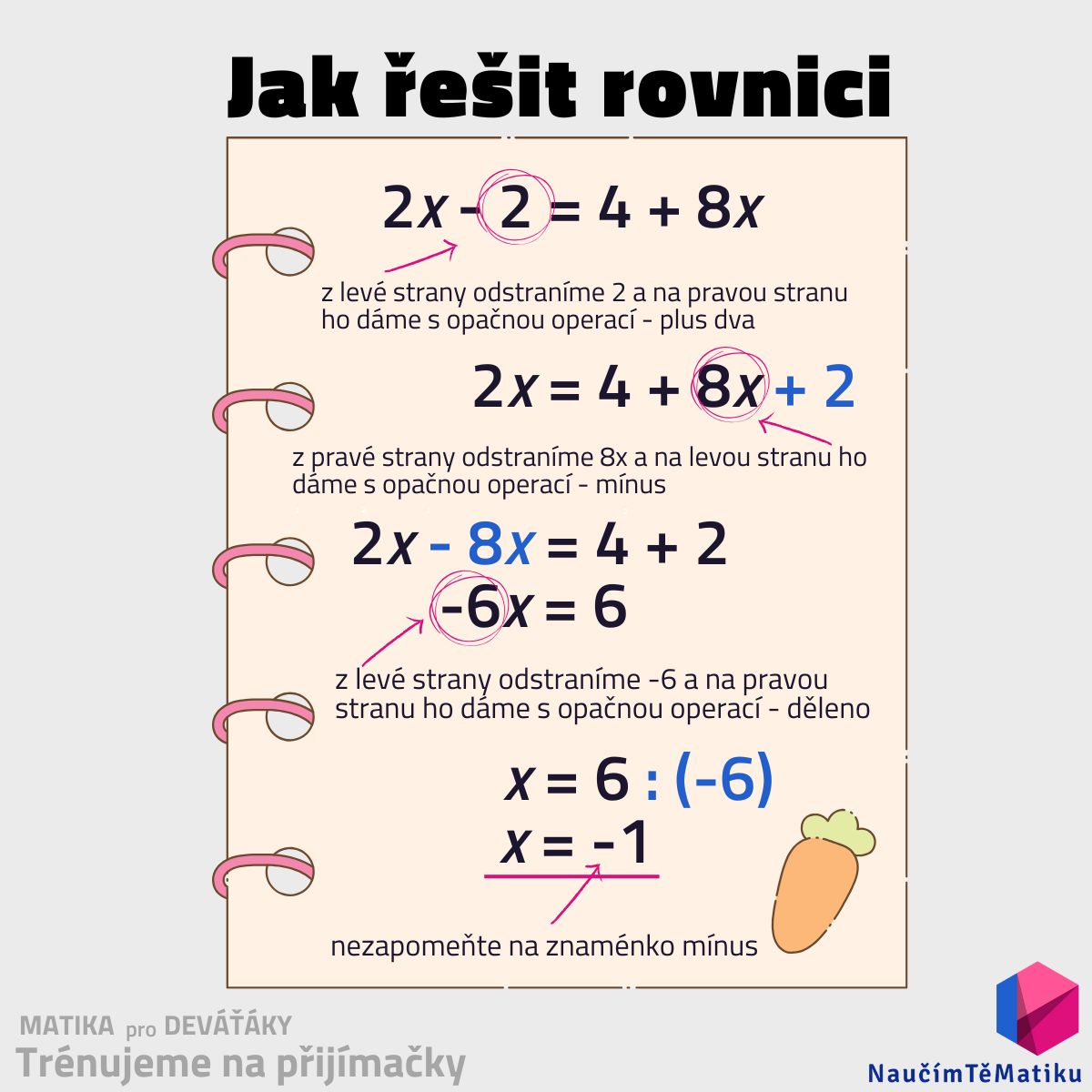 Rovnice jsou základem. Potřeba jsou nejenom ve čtvrtém příkladu, ale taky u řady slovních úloh. Začneme rovnicemi, ve kterých jsou jen závorky, mocniny a maximálně desetinná čísla.