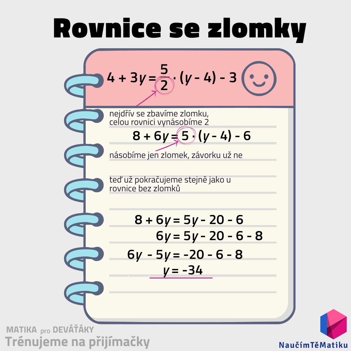 Druhá kapitola nás posune při řešení rovnic o level výš. Stačí se naučit jednoduché pravidlo, jak se zlomků zbavit a pak už rovnice vypadá a řeší se stejně jako ty v předchozí kapitole.